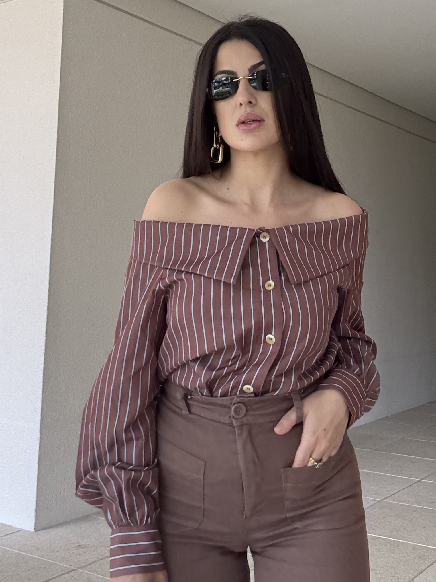 A peça-chave para um look effortless chic. Com modelagem estruturada e padronagem listrada em tons terrosos, esta blusa destaca-se pelo decote ombro a ombro e fechamento frontal funcional. Sua modelagem equilibrada permite composições versáteis: fica perfeita tanto com calças de cintura alta para um visual clássico, quanto com cinturas médias ou baixas para uma proposta mais moderna e despojada.